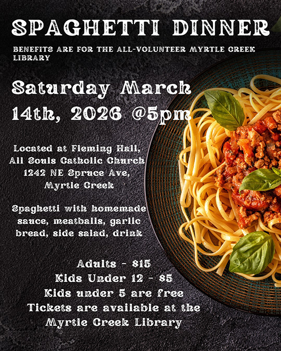 The Myrtle Creek Lions held its annual crab feed last Saturday, February 7, at Coffenberry Middle School Cafeteria. The event, according to organizers, was another successful year for the club with all the proceeds from the event going back into the community through sight and hearing and other service projects. (ABOVE) Lions club member Gail Black (LEFT) and one of the friends of the Lions Kristin Myhre (RIGHT) take a minute from their work at the auction table to take a photo with the event’s mascot Kenneth the Crab also known as Crabby.